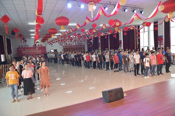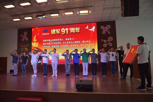 台下全体员工排成“八.一”队形,寓意今天特殊的日子,通过观看大阅兵视频和军人冲锋在前,在灾难之际,奋不顾身,不惜流血牺牲的场景,全场无不震撼!