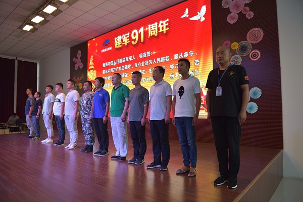 面对鲜红的“八一”军旗,举起右手,用最响亮的声音,喊出我们在新时代下的强音,在场的每一们家人都为之感染,情不自禁的鼓掌!祝福所有的军人!