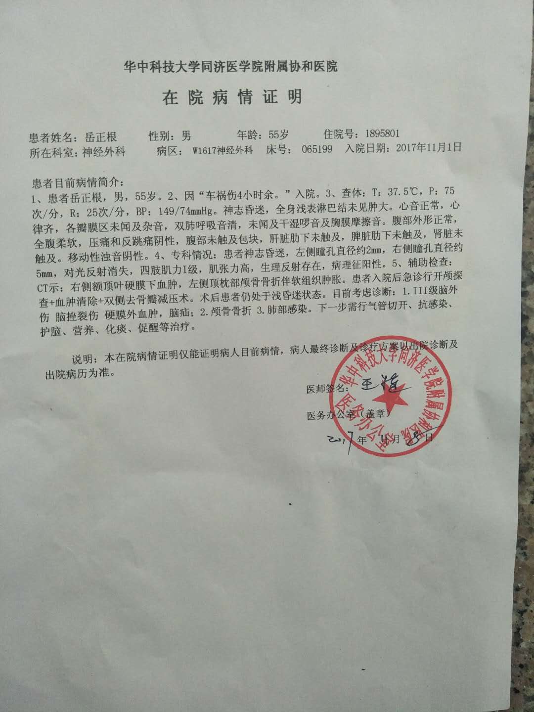 MK网服务部服务人员岳亮他57岁的老父亲在骑摩托车在312国道寨河转盘左地被对向一辆轿车撞飞。头部着地导致颅内血及腰部骨折,于当晚转院至武汉市协和医院抢救,进行两次开颅手术,目前仍在重症监护室观察。