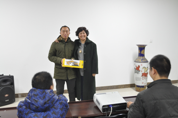 上图为二等奖选手王果向大家展示奖品,锌合金套装一套,希望她以后能有更加出色的表现!