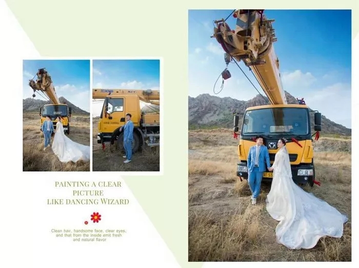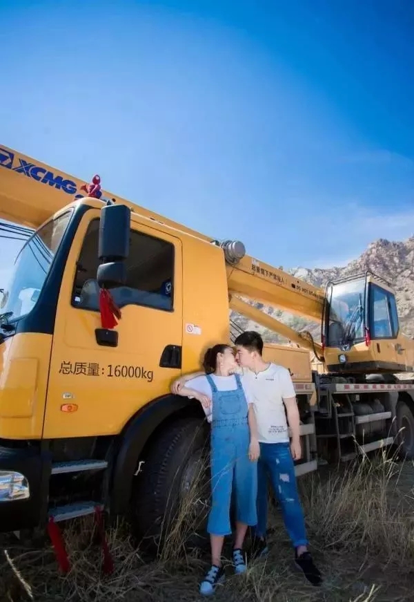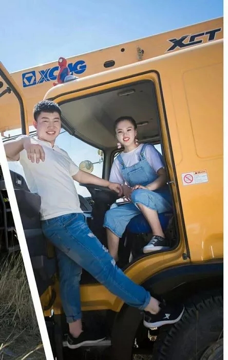 照片中的男主人公叫王森,出生自1998年的年轻小伙,2019年5月12日刚刚完婚,结婚照背景是MK网XCT12,不是为了风格新颖,而是因为他们都爱起重机。