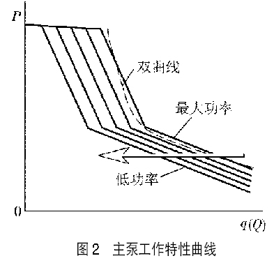图1表明中心开式负荷传感液压系统(OLSS)的原理。图2是主泵工作的特性曲线,泵在一定转速下,工作点无论在哪条曲线上,它的纵、横坐标分别是压力和流量,两者的乘积就是功率。