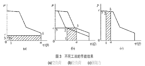 该系统在发动机带动主泵空运转时,全部液压油通过主阀中心回油箱。在节流阀前回油压力最大,此最大的压力驱使变量液压缸使主泵输出流量最小,故称之为负流量控制系统。当人为操作控制手柄、踏板满负荷工作时,情况与上述相反,主泵则输出最大功率。在中等负荷工作时,控制主阀开度不大,主泵输出功率介于上述两种情况之间。总体来看,其效果与中心开式负荷传感系统是相同的,它的主泵特性曲线也类似图2,其节能效果也可用图3描述。