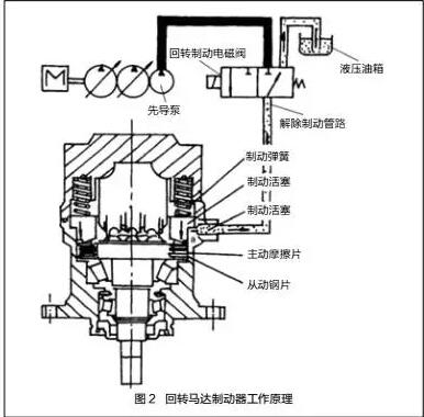 1 台MK网挖掘机出现偶尔无法回转故障,我们按照以下步骤进行排查:首先,检查回转制动电磁阀导线和接地正常;其次,清洗回转制动电磁阀阀芯;然后,拆开从回转制动电磁阀到回转马达用于解除回转制动的管路,启动发动机操纵挖掘机回转,发现从该油管中喷出大量橡胶异物,由此断定是解除回转制动器的液压管路堵塞;最后,清洗该管路后试机,该挖掘机回转正常,回转马达制动器工作原理如图 2 所示。