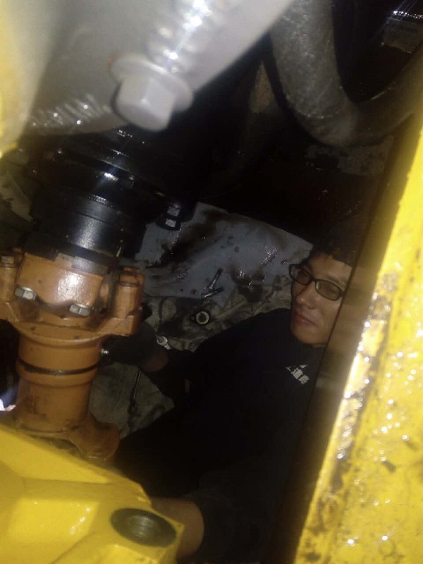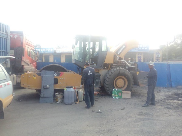 由于安阳下大雨,路面存在大量积水,经过几番绕路之后,于夜里10点到达用户工地。到工地将泵、液压等系统检查完毕判定为变速箱内部故障。因夜晚检修存在局限性,计划次日早上6点维修。此时用户告知14日一早就要用车,工地只此一辆压路机。紧急之下,为节省维修时间如期让用户能用车,我站立即做出应急处理方案---更换变速箱总成,并安排服务工程师王攀从郑州专车将变速箱总成送往用户工地。