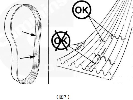 (1)每天应检查皮带。检查皮带是否有交叉裂纹。横向(宽度方向)裂纹可以接受。与横向裂纹交叉的纵向裂纹是不能接受的(见图7)。