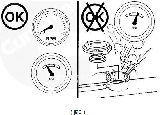 (1)不要从热柴油机上直接打开散热器压力盖。应等到冷却液温度降至 50°C 以下时,才能打开散热器的压力盖(见图3),否则高温冷却液或蒸汽喷出可能会造成人身伤害。