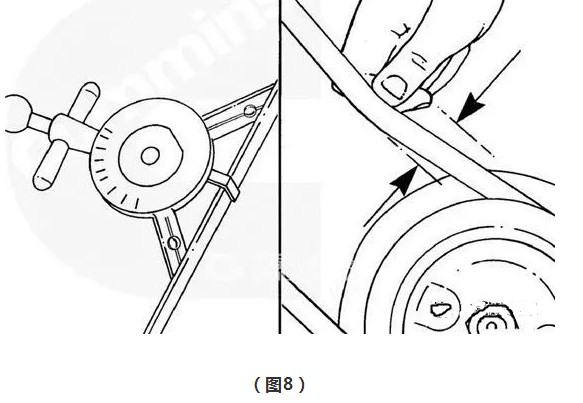 如果皮带磨损或残缺,则进行更换。在皮带轮间的 V 形皮带上施加 110 N 的作用力,来检查皮带张力。如果每英尺皮带轮中心距的挠度超过了皮带厚度(见图8),必须调整皮带张力。