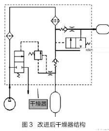 装载机高频次制动时,短时间内要消耗大量的压缩空气。为了有效保证制动,空压机必须优先向储气筒供气,然后给再生储气筒供气。为此,我们在干燥器的再生储气筒进口管路上增加了单向阀及逻辑阀,逻辑阀的开启压力低于810kPa、高于680kPa,这样就能保证空压机优先向储气筒供气。改进后干燥器结构如图3 所示。